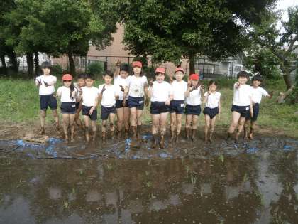 さっそく、今日の6時間目、5年生の1組とあさひ学級の全員で田植えをしました。