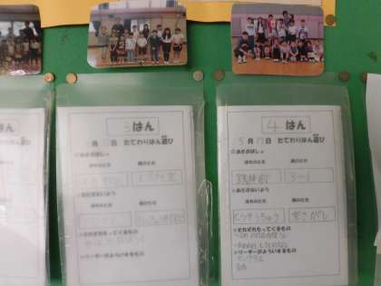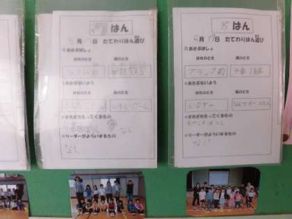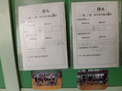 朝の縦割り班遊びは保健室の前の掲示板に貼ってあり、どんなことをするのか、集合場所はどこなのか、持ち物は何かをリーダーが書いて入れるようになっています、1〜5年生はその紙を見ながら行動します。
