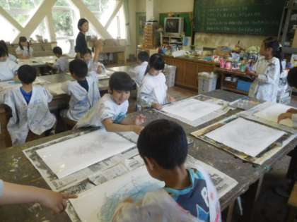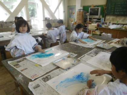 溶けた氷が残した水の上に絵の具のかけらを落として海が作られていきました。