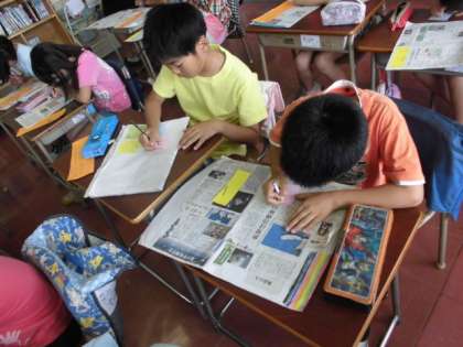 4年生は今、国語で調べたことを整理して書こう「新聞をつくろう」の学習をしています。今までは、実際の子供新聞の記事を切り抜いて切り貼りして新聞を作り、お互いに交換しあってお互いの良いところを見つけてコメント書いていました。