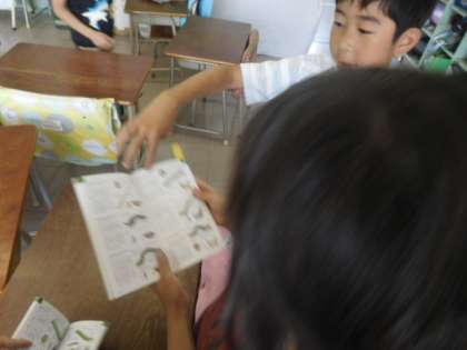 取ってきたら子供たち同士で図鑑を使って調べます!