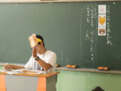 1年生の担任は机を橋の上にみたてて担任が被り物をして子供たちと一緒に気持ちを考えていました。