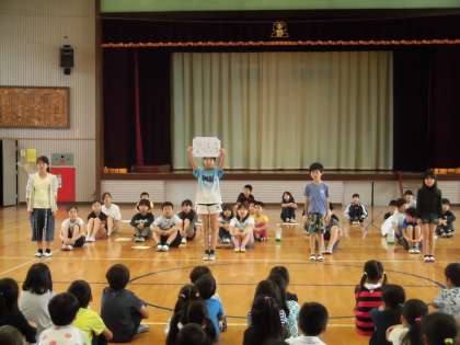 今日の朝の集会は委員会紹介集会でした。放送委員会の皆さんです。