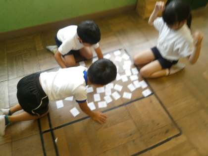 3年生は暗算の勉強です。足して100になる数の練習問題を何問か解いたら暗算カルタ。先生が「64+□=100」というと36の数字が書かれた札を早く取るゲームです。中々取れずに、「もう嫌だ〜」なんて声も聞こえてくることがありましたが、それでも、次の問題が読まれて取ることができるとニッコリと笑顔を見せてくれました。