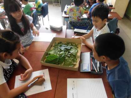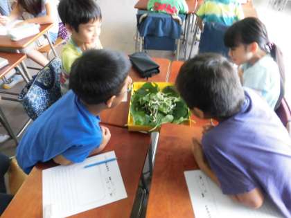 3年生が総合的な学習の時間「カイコ博士になろう」で、カイコの観察カードを書きました。みんな熱心にカイコの桑の葉を食べる様子を観察しながら記録カードを書いていました。