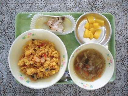 チェブは米、ジェンは魚という意味で、魚や野菜の煮汁でお米を煮た、パエリアやピラフに似た料理です。トマトソースを加えてごはんを赤くした「赤チェブジェン」と、トマトソースを加えない「白チェブジェン」があるそうです。今日の給食は「赤チェブジェン」でした。