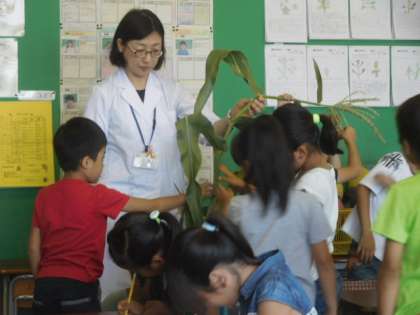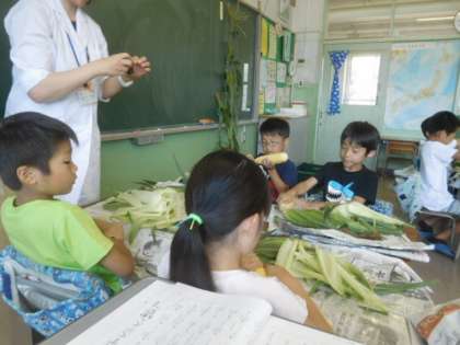 最後は実際に植わっている状態と同じトウモロコシを触ってみました!