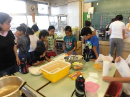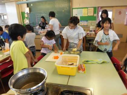 「水鉄砲バトル」と「縁日」のあとは、「カレー作り」です。1年生から6年生までが一緒になり、保護者の方やPTA本部の方、親児の会の皆さんがサポートしながら作りました。