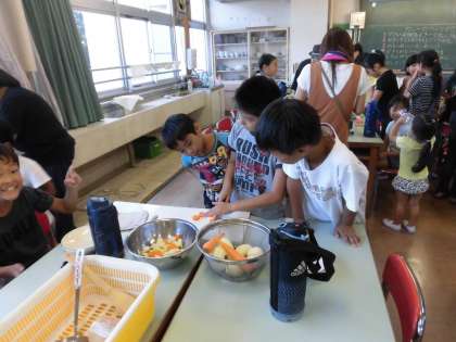 「水鉄砲バトル」と「縁日」のあとは、「カレー作り」です。1年生から6年生までが一緒になり、保護者の方やPTA本部の方、親児の会の皆さんがサポートしながら作りました。