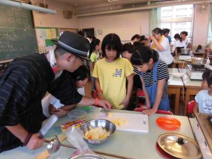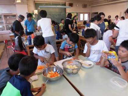 「水鉄砲バトル」と「縁日」のあとは、「カレー作り」です。1年生から6年生までが一緒になり、保護者の方やPTA本部の方、親児の会の皆さんがサポートしながら作りました。