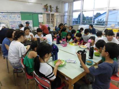 「水鉄砲バトル」と「縁日」のあとは、「カレー作り」です。1年生から6年生までが一緒になり、保護者の方やPTA本部の方、親児の会の皆さんがサポートしながら作りました。