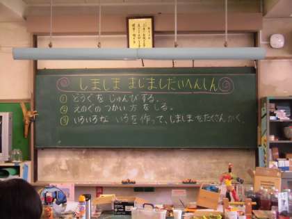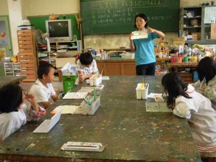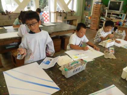 2年生の今日の図工は「しましま ましましだいへんしん」という題名で、水彩絵具を使っていろいろなしましまの模様を画用紙に描きました。