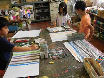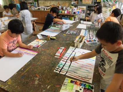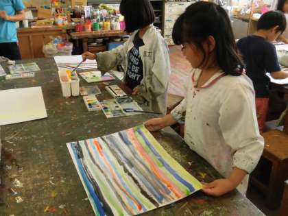 2年生の今日の図工は「しましま ましましだいへんしん」という題名で、水彩絵具を使っていろいろなしましまの模様を画用紙に描きました。
