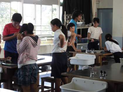 理科室で実験をしていました。