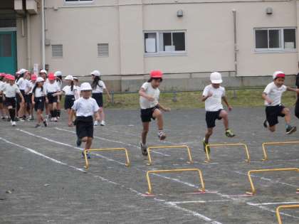ミニハードルのタイムを計っていました。