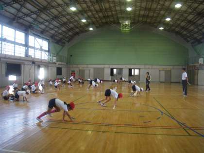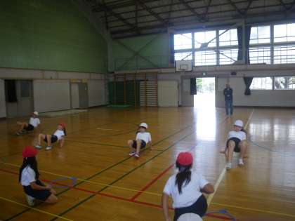 3,4年生の体育の学習です。マット運動をするそうですが、その前の準備の活動です。