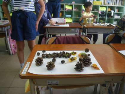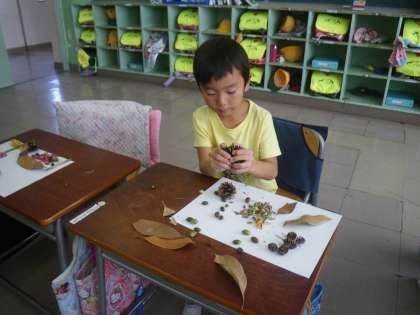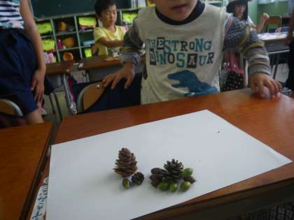 さっそく教室で作品作りです。松ぼっくりや落ち葉、どんぐりなどを使って思い思いの作品をつくって鑑賞しあっていました。友達の作品をたくさん褒めていました。