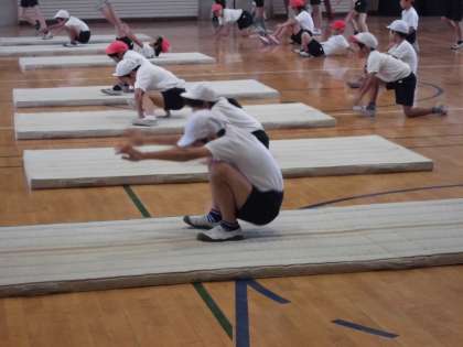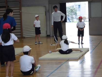 今日は、開脚前転をしていました。
