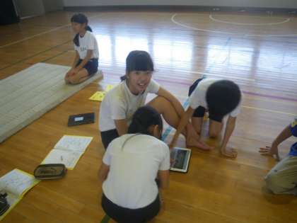 5,6年生混成のグループを作り、お互いにアドバイスし合います。その時に様子がわかりやすいようにタブレットを使って、回っている様子を動画で撮り、見ながら説明しています。