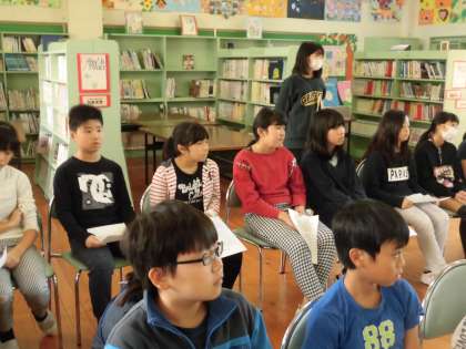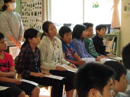 子供たちは皆真剣に話を聞いていました。今日お話をしてくださった方は、八王子空襲を受けた時6年生だったそうです。校舎も半分焼け落ち、卒業式は校庭で行ったそうです。