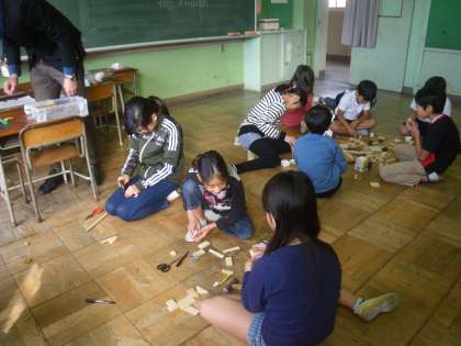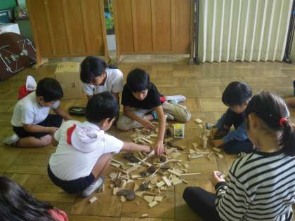 木端でこびとを作りました。高学年が低学年にやさしく教えてあげたり手伝ってあげたりしていました。