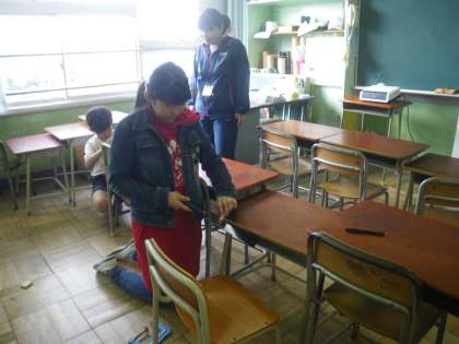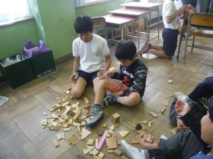 木端でこびとを作りました。高学年が低学年にやさしく教えてあげたり手伝ってあげたりしていました。