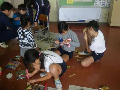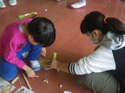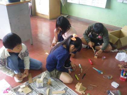 木端でこびとを作りました。高学年が低学年にやさしく教えてあげたり手伝ってあげたりしていました。