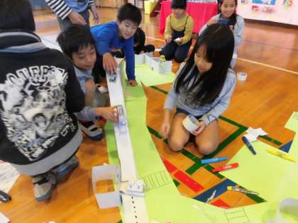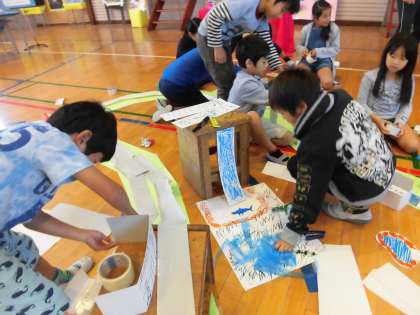 今日は展覧会前最後の図工の授業を3年生が会場の体育館で行いました。
