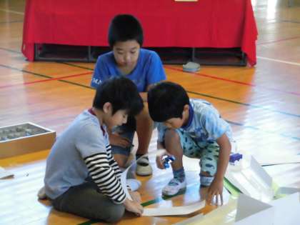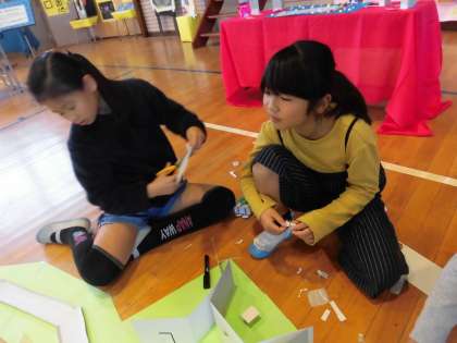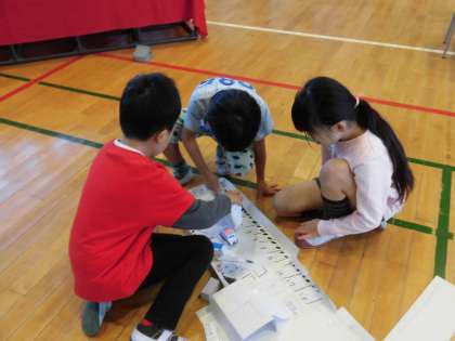 今日は展覧会前最後の図工の授業を3年生が会場の体育館で行いました。