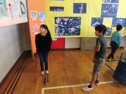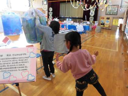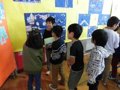 展覧会1日目です。1日目の5時間目までは児童鑑賞です。2時間目に2年生と5年生が一緒に鑑賞しました。5年生が2年生に作品の説明をしていました。途中から自由鑑賞の時間になりました。みんなとっても楽しそうでした。