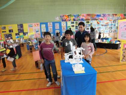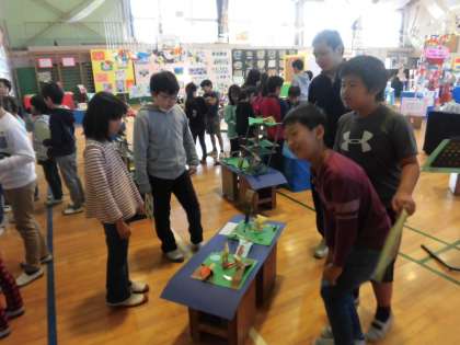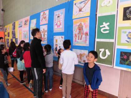 展覧会1日目です。1日目の5時間目までは児童鑑賞です。2時間目に2年生と5年生が一緒に鑑賞しました。5年生が2年生に作品の説明をしていました。途中から自由鑑賞の時間になりました。みんなとっても楽しそうでした。