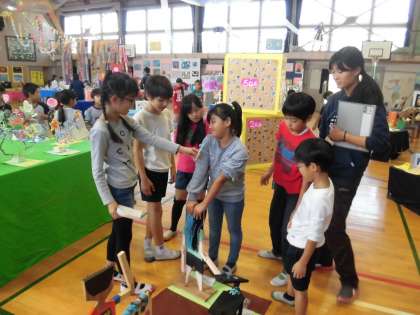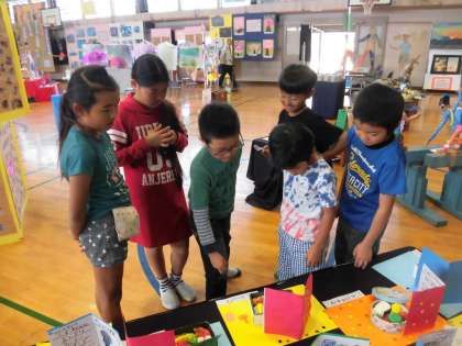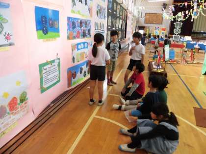 1日目の5時間目までは児童鑑賞です。3時間目に3年生と4年生が一緒に鑑賞しました。4年生がリードしながらお互いの作品の説明をしていました。