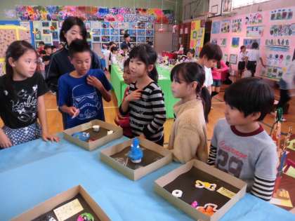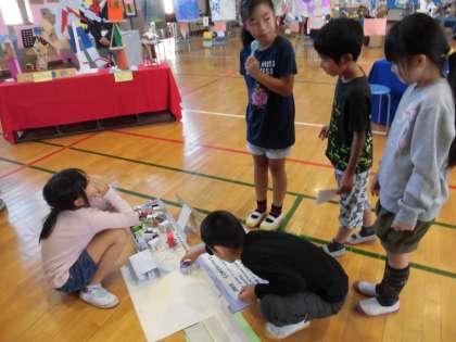 1日目の5時間目までは児童鑑賞です。3時間目に3年生と4年生が一緒に鑑賞しました。4年生がリードしながらお互いの作品の説明をしていました。