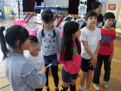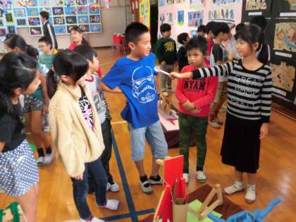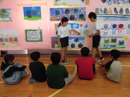 1日目の5時間目までは児童鑑賞です。3時間目に3年生と4年生が一緒に鑑賞しました。4年生がリードしながらお互いの作品の説明をしていました。