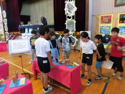 1日目の5時間目までは児童鑑賞です。3時間目に3年生と4年生が一緒に鑑賞しました。4年生がリードしながらお互いの作品の説明をしていました。