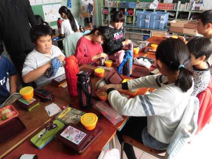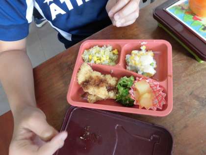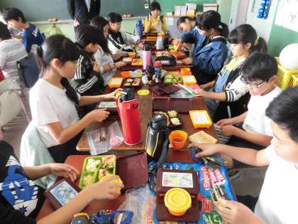 今日、6年生が中学校給食を試食しました。今、中学校の給食はお弁当形式です。