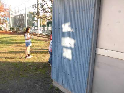 3年生は理科の学習で今、「光」の学習をしています。1時間目は教室で映像を使用して学習していました。5時間目は校庭に出て、実験をしていました。