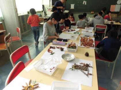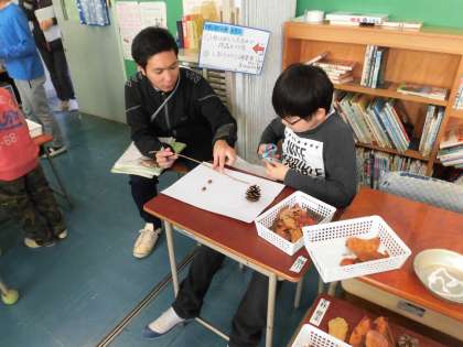 秋探しで拾った、落葉などを画用紙に貼り付けていました。