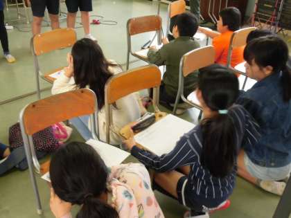 6年生の音楽の時間は「ふるさと」の二部合唱を全体で歌ってからグループごとに二部合唱の発表を行いました。発表をしているとき、聴いているグループは感想など書いていました。