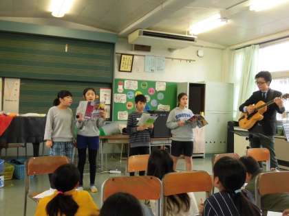 6年生の音楽の時間は「ふるさと」の二部合唱を全体で歌ってからグループごとに二部合唱の発表を行いました。発表をしているとき、聴いているグループは感想など書いていました。