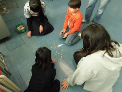 めんこ、けん玉、おはじき、こま、の4つに分かれて体験していました。
