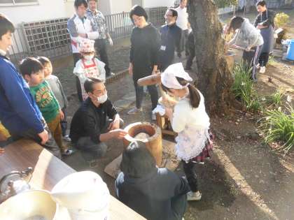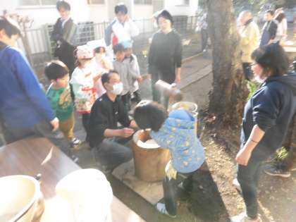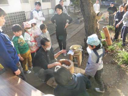 先週の土曜日の放課後、親児の会とPTAの共催で「餅つき会」を行いました。