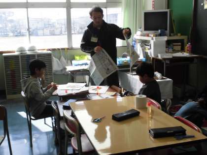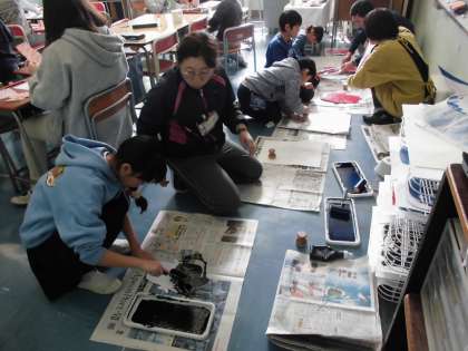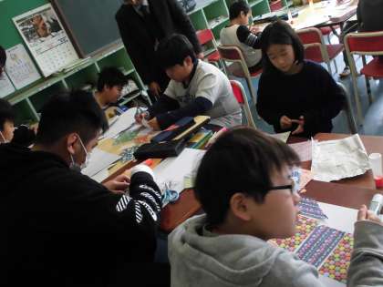 版画以外の子供たちは、画用紙に、柄のある紙を切って、