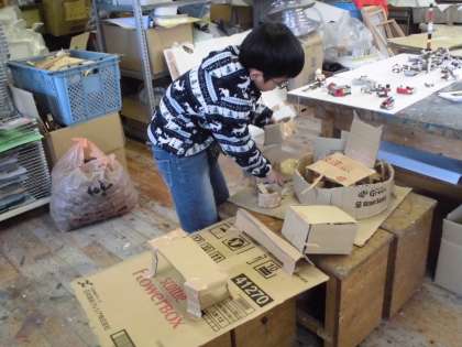 ダンボールをダンボールカッターで切っていくと