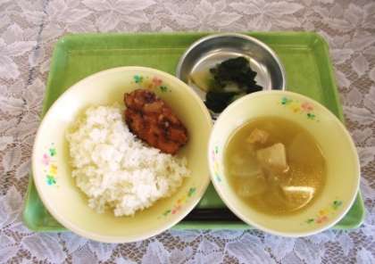 鶏の出汁唐揚げは、昆布と鰹節を煮たてた「出汁」に、酒とみりんを加えて「八方出汁」を作り、その出汁に漬け込んだ鶏肉を唐揚げにしました。船場汁は大阪の郷土料理です。サバとたっぷりの大根を出汁に加えて煮込んだ汁物です。「かぶら」は「かぶ」の別名です。