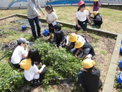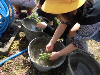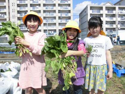 1年生が育てた、ほうれんそう、春菊を収穫し
