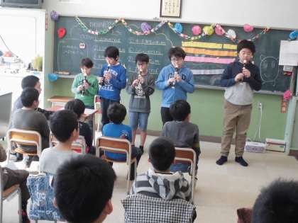 1〜5年生や先生方が、歌や合奏、リコーダー演奏を披露しました。