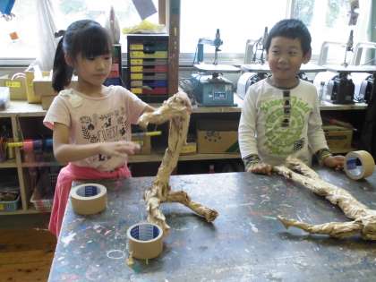 針金の骨を入れて、ガムテープで巻き、顔も作る。