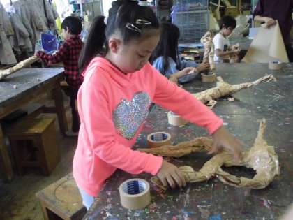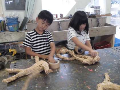 針金の骨を入れて、ガムテープで巻き、顔も作る。