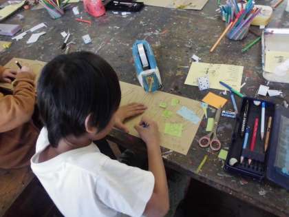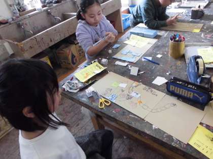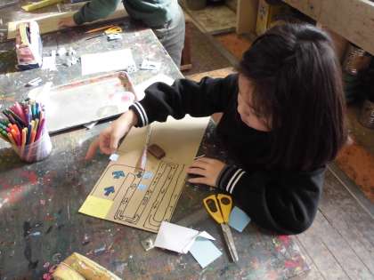 紙をいっぱいつなげて、すごろくゲームを作りました。